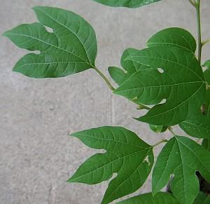 シロモジの葉は互生し、長さ8cm~12cm程の倒卵形ですが、普通3裂から5裂して、3脈が目立ちます。また、秋になると紅葉します。